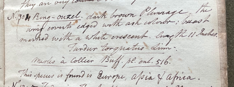 Peale wrote, in "A Walk Through the Philad[elphi]a Museum" (1805–1806): "No. [blank] Ring-ouzel (T. Torquatus) found in Europe, Assia & Africa." (Historical Society of Pennsylvania, coll. 0481)