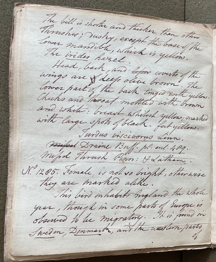 Charles Willson Peale (1741-1827) wrote, in his 31st Lecture (ca. 1799): "No. 1284. Missel Thrush. This is the largest of the genus, and weights near five ozes. Its length is 11 Inches; its breath 16 ½. The bill is shorter and thicker than other Thrushes; dusky, except the base of the lower mandible, which is yellow. The irides hazel. Head, back, and lesser coverts of the wings are deep olive brown. The lower part of the back tinged with yellow. Cheeks and throat mottled with brown and white; breast whitish yellow, marked with large spots of black. Feet yellow. Turdus viscivorus Linn. Missel Draine Buff. pl. enl. 489. Missel Thrush Penn; & Latham." (Academy of Natural Sciences of Drexel University Archives, coll. 40)