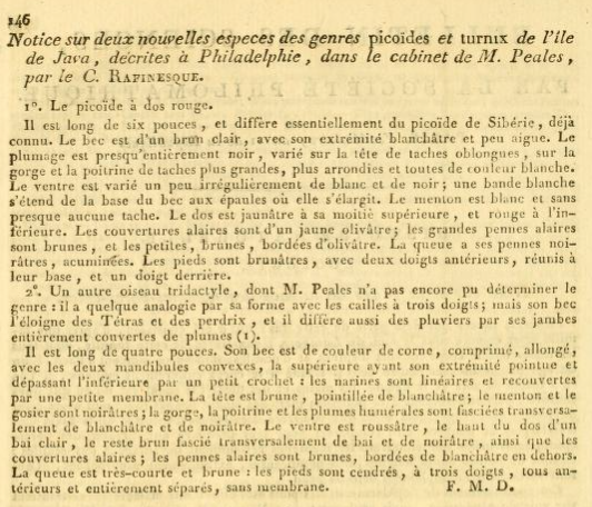 Constantine Rafinesque (1802). Notice sur deux nouvelles espèces des genres picoïdes et turnix de l'île de Java, dècrites & Philadelphie, dans le cabinet de M. Peales. Bulletin Des Sciences Par La Société Philomathique 67: 146. / https://www.biodiversitylibrary.org/page/5495154#page/172/mode/1up