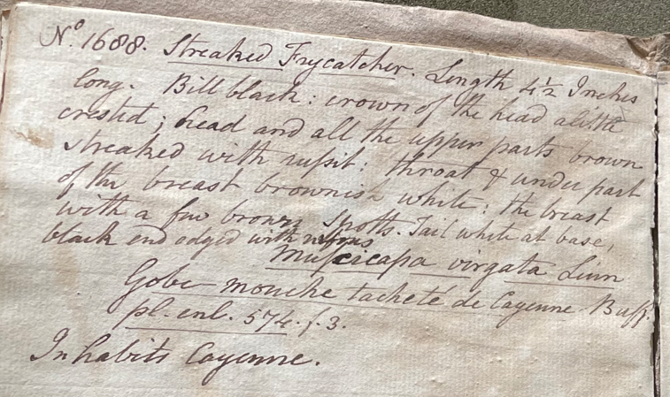 Charles Willson Peale (1741-1827) wrote, in his 35th Lecture (ca. 1799): "No. 1688.Streaked Flycatcher. Length 4 ½ Inches long. Bill black; crown of the head a little crested; head and all the upper parts brown streaked with russet; throat & under part of the breast brownish white; the breast with a few brown spots; tail white at base, black and edged with rufous. Muscicapa virgata Linn. Gobe-mouche tachete de Cayenne Buff. pl. enl. 574. f. 3. Inhabits Cayenne." (Academy of Natural Sciences of Drexel University Archives, coll. 40)