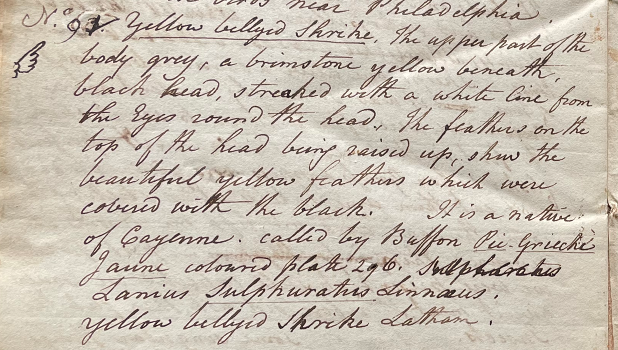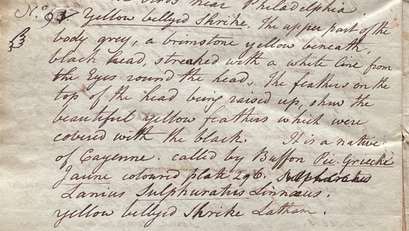 Charles Willson Peale (1741-1827) wrote, in his 15th Lecture (ca. 1799): "No. 94. Yellow bellyed Shrike. The upper part of the body gray, a brimstone yellow beneath, black head, streaked with a white line from the eyes round the head. The feathers on the top of the head being raised up, show the beautiful yellow feathers which were covered with the black. It is a native of Cayenne, called by Buffon Pie-Griêche Jaune, coloured plate 296. Lanius sulphuratus Linnaeus. Yellow bellyed Shrike Latham." (Academy of Natural Sciences of Drexel University Archives, coll. 40)