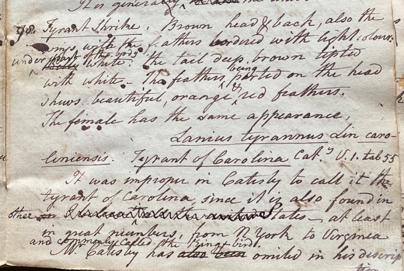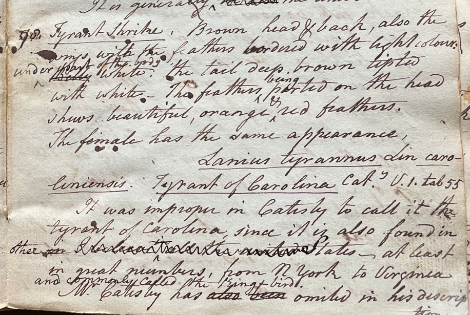 Peale wrote, in "A Walk Through the Philad[elphi]a Museum" (1805–1806): "They [Shrikes] are a bold race, but none more daring than the King bird (Tyrannus), he dares to fix on the back of Eagles & Hawks, and masters even the largest of them, thus he may be considered the protector of our Poultry, but then he is equally destructive of Bee's." (Historical Society of Pennsylvania, coll. 0481)