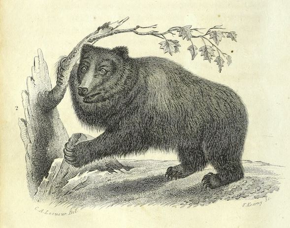 John Godman describes and illustrates this species, which he identifies as Ursus horribilis, or the "Brown Bear of Lewis & Clark,"in American Natural History, 1: 131-143 / https://hdl.handle.net/2027/dul1.ark:/13960/t4wh6dv4h?urlappend=%3Bseq=…; a detail of the image, an engraving by Francis Kearny after a drawing by C. A. Lesueur, is pictured here.