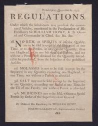 British proclamation setting limits on the quantity of spirits, molasses, salt, and medicines that may be purchased by residents of Philadelphia., 1777