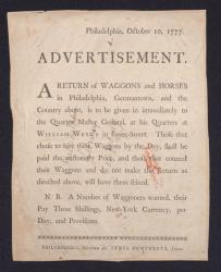 British proclamation ordering Philadelphia and Germantown residents to report to the Royal army on the availability of wagons and horses, 1777