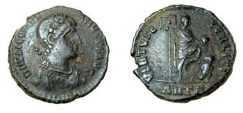 [Roman coin:] [Obverse:] D.N. Valentinianus Jun. P. f. aug.; [Reverse:] victoria coronans Valentin & valens. victoria aug.