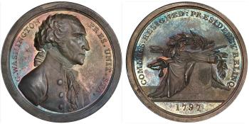 A Medal of Geo[rg]e Washington, President of the U.S. Reverse Commiss[ion] resigned. Presidency Relinq[uished]d 1797 Struck for the donor