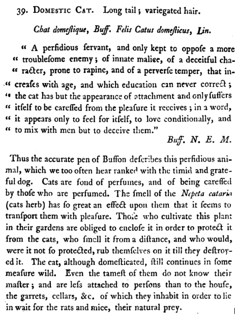 In his Natural History Lecture No. 4 (1799), Academy of Natural Sciences of Drexel University, Peale wrote: "the Cat, although an animal of Prey, is a useful domestic. It is neither wanting in sagacity nor sentiment; but its attachments are stronger to places than to persons. The Cat is handsome, light, adroit, cleanly and voluptuous; he loves ease, and searches out the softest furniture in order to repose on, and rest himself.Cats having a feeble scent, do not pursue animals which they do not see; they do not hunt, but wait and attack them by surprise."