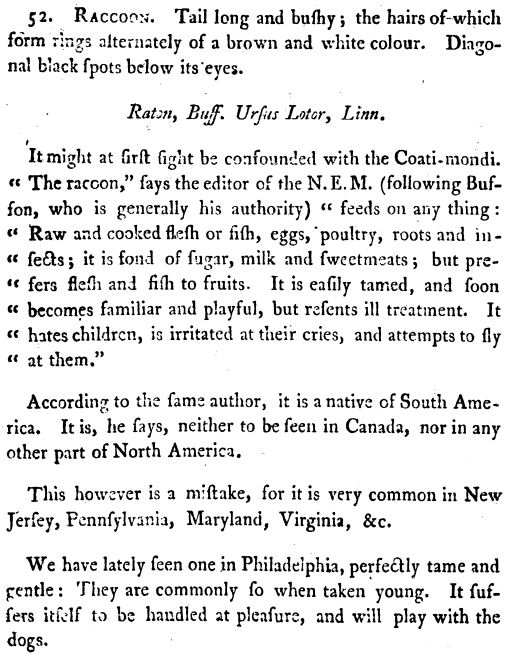 In his Natural History Lecture No. 5 (1799), Academy of Natural Sciences of Drexel University, Peale wrote: "The Lotor, or Racoon is a native of all the states of America, & it is said to be extremely troublesome in Jamaica – Is easily made tame, very good natured, and sportive, but sometimes plays a little too rough. It is almost always in Motion; very inquisitive, examining every thing with its paws. It makes use of them as hands; sits up to eat; is extremely fond of sweet things, and will get excessively drunk. It has all the cunning of the fox; is very destructive of Poultry; but will eat all sorts of fruits, green corn &c.
