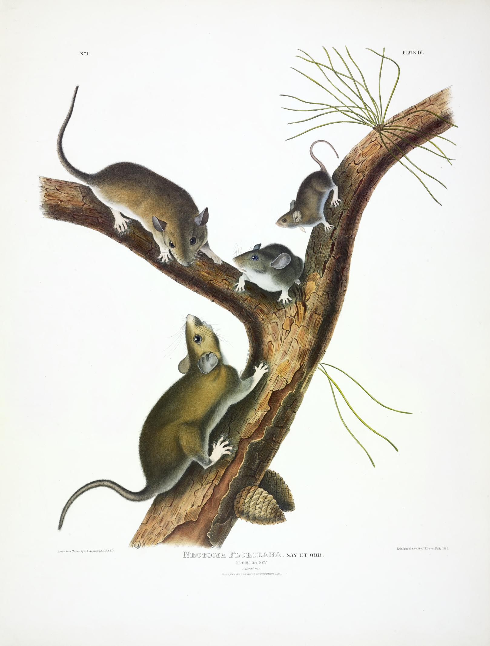 The eastern woodrat (Neotoma floridana), also known as the Florida woodrat or bush rat, is a pack rat native to the central and Eastern United States. The image is plate 21 accompanying the Say and Ord article. See also Richard Harlan, Fauna Americana: Being a Description of the Mammiferous Animals Inhabiting North America (Philadelphia, 1825), pp. 141-143 / https://www.biodiversitylibrary.org/page/3194439 / where he assigns the name Arvicola floridanus and bases his description on two specimens in the Museum -- this one from Florida and one brought back by the Long expedition (which Titian Ramsay Peale prepared and deposited in the Museum on 23 Mar 1821). Peale Museum Accessions Book, Historical Society of Pennsylvania, p. 112