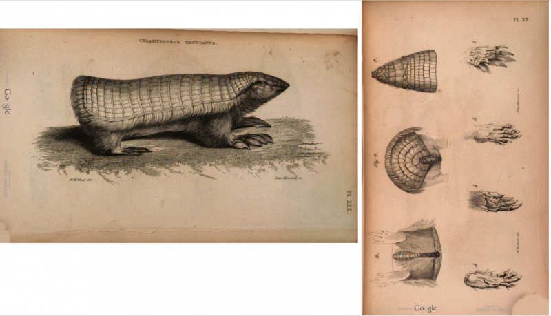 The pink fairy armadillo (Chlamyphorus truncatus) or pichiciego is the smallest species of armadillo (mammals of the families Chamyphoridae and Dasypodidae, recognized by a bony armor shell). It was first described and illustrated by Richard Harlan (based on this specimen) in "Description of a New Genus of Mammiferous Quadrupeds, of the Order Edenta," in Annals of the Lyceum of Natural History of New-York, 1 (1824-1825): 235-246 and plates 19 and 20, pictured here. He described the donor as "a young but zealous naturalist" / https://hdl.handle.net/2027/hvd.32044092768159?urlappend=%3Bseq=261