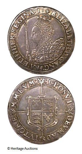 An example of a one crown (five shilling) silver coin of 1601 or 1602 from the reign of Elizabeth I (1558-1603) is pictured here.