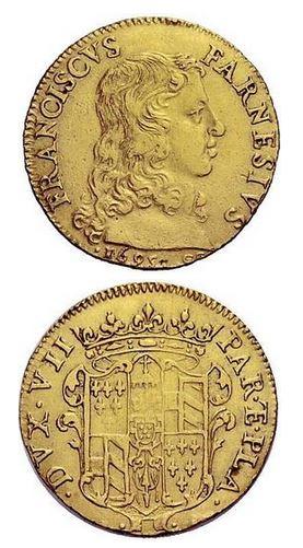 Francesco Farnese (1678-1727) reigned as the seventh Farnese Duke of Parma and Piacenza from 1694 until his death. Du Simitière's coin may have been similar to this 1695 gold 1 doppia coin issued by the Duchy of Parma.