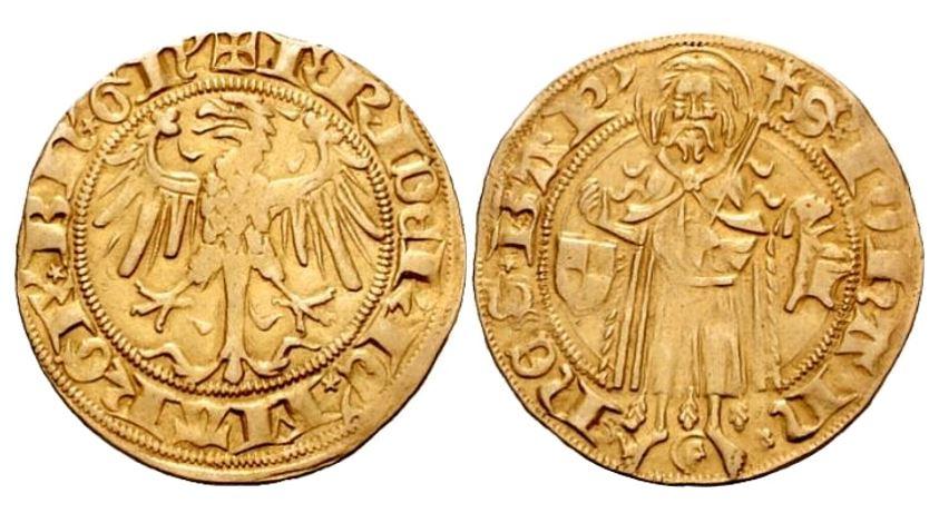 Du Simitière may have had a coin from the time of Frederick I (1371-1440), Elector of Brandenberg from 1415 (and also Margrave of Brandenburg-Ansbach from 1398 and Margrave of Brandenburg-Kulmbach from 1420) similar to the gulden pictured here from 1419 to 1424.