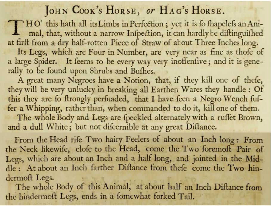 "One commonly call'd John Cook's horse le Cheval du Diable (mantis) about two inches long, the other a black ichneuman fly, with an uncommon long tail divided into five joints 1/4 of an inch long, each, and very long hind legs."