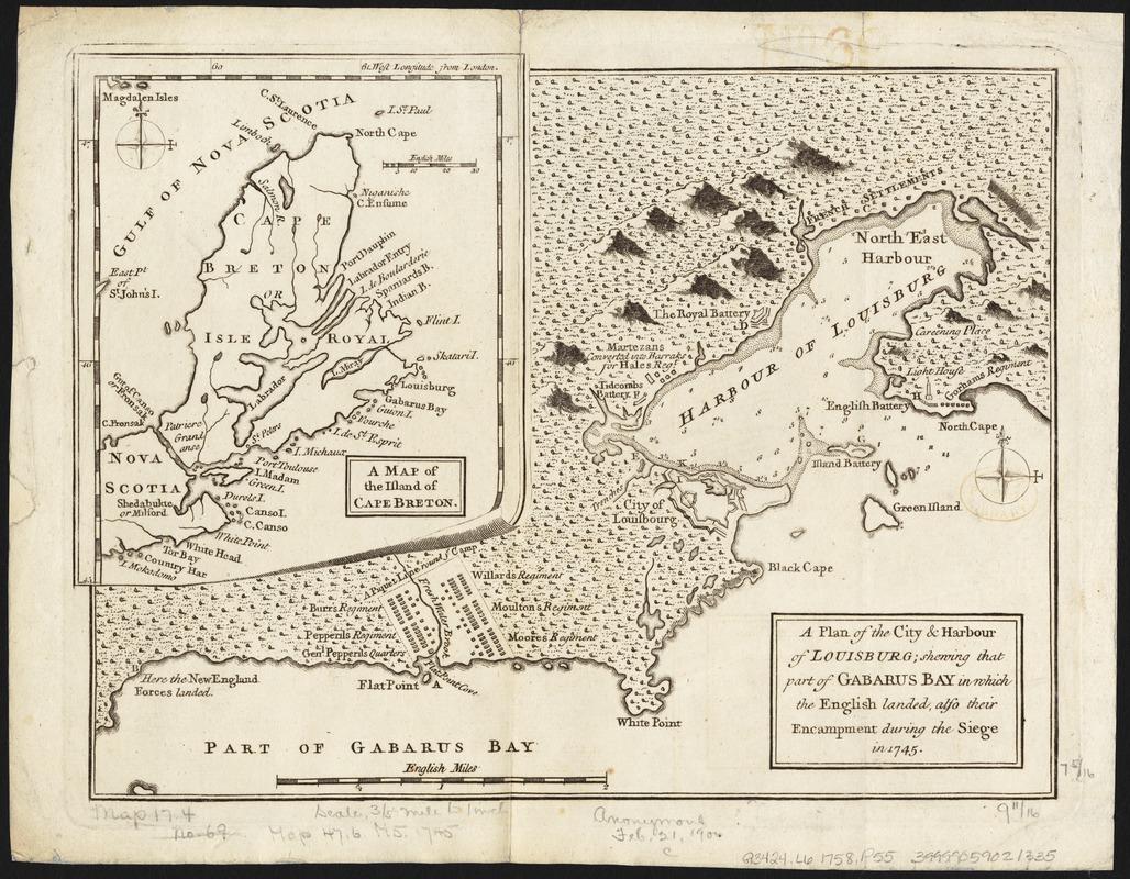 "A plan of the city & harbour of Louisburg: shewing that part of Gabarus Bay in which the English landed, also their encampment during the Siege in 1745" was published in (Gentleman's Magazine, vol. 28 (1758).