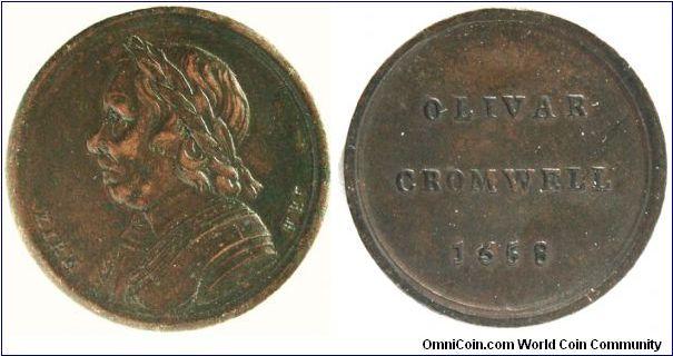 This was one of a set of thirteen tokens from the Sentimental Magazine, commemorating Oliver Cromwell (1599-1658). From an advertisement in the Bath Journal, Monday, March 29th, 1773: "The Sentimental Magazine. A NEW MAGAZINE, With every Number of which will be given a curious MEDAL, struck on fine Metal, about the Size and Weight of a Guinea, executed by Mr. KIRKE [John Kirk (1724-1776)], who is universally esteemed the First Artist in London in his Profession. This Medal will of itself, exclusive of the Magazine, be Worth at least Half-a-Crown; it will represent some reigning Toast, some Great Personage, some Hero celebrated in the Annals of our own Kingdom, or in those of the Continent, some Patriot, or some uncommon literary Genius." See also Martin Warburton, Sentimental Magazine Medals (2018).