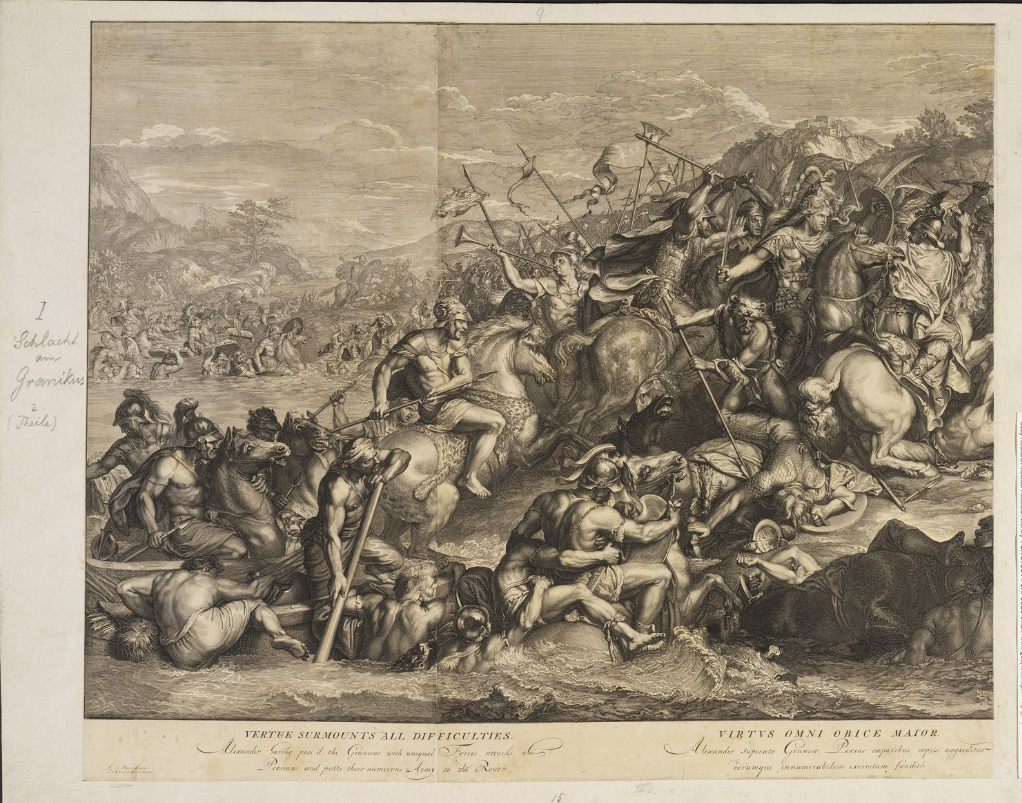 Engravings by Pieter Stevens Van Gunst (1659?-1724?), after Charles Le Brun (1619-1690), The Battles of Alexander (early 18th century). This work comprises 5 prints on 13 sheets and 10 mounts; sheets 71 x 54 cm, mounts 74.5 x 103 cm or smaller; the prints reproduce Le Brun's five canvas paintings from the series known as The Battles of Alexander: the Crossing of the Granicus (pictured here), the Battle of Arbela, the Queens of Persia at the feet of Alexander (Tent of Darius), Alexander and Porus, and the Entry of Alexander into Babylon. Getty Research Institute website; the entire series is accessible at http://hdl.handle.net/10020/2003pr53