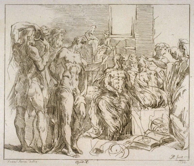 Fine Arts Museums of San Francisco has four of the prints: Group of mathematicians disputing; Group of five figures; Holy family with St. John; and A philosopher reading, the first of which is pictured here.