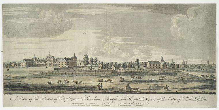 Engraving by Nicholas Garrison (1701-1781), after James Hulett (d. 1771), "A View of the House of Employment, Alms-House, Pennsylvania Hospital, and Part of the City of Philadelphia" (ca. 1767)