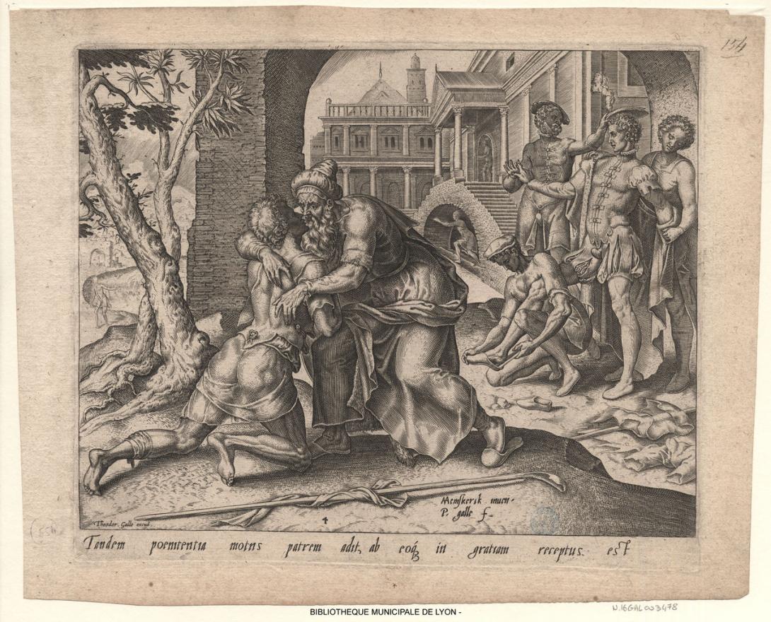 Engraving by Maarten van Heemskerck (1498-1574) of Le fils prodigue rentre chez son père, after Phillippe Galle (1537-1612)
