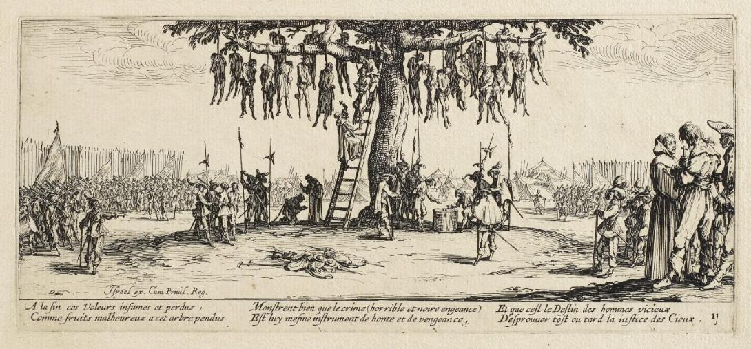 Jacques Callot (ca. 1592-1635) executed a series of eighteen etchings as Les Misères et les Malheurs de la Guerre (The Miseries and Misfortunes of War) (1633); all can be viewed at https://en.wikipedia.org/wiki/Les_Grandes_Mis%C3%A8res_de_la_guerre; the most famous of the suite is La Pendaison (The Hanging), pictured here. The etchings are indeed "petite," measuring only 8.3 cm × 18 cm (3.3 in × 7.1 in).