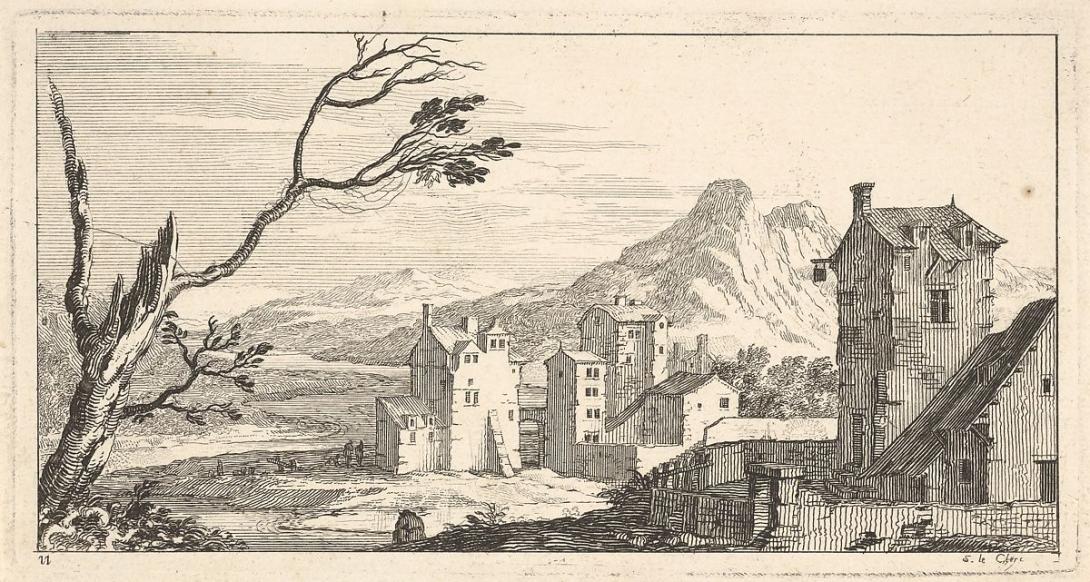 Probably the twelve etchings by Sébastien Leclerc or Le Clerc (1637-1714) comprising his Livre de paysage dédié à Monsieur de Beringhen (1693), one of which is pictured here (View of a City, plate XI)