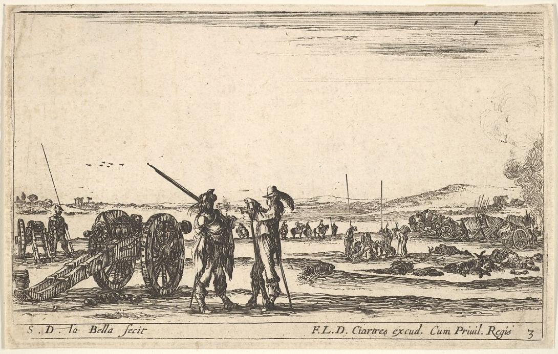 Stefano della Bella (1610-1664) executed a suite of six Varii capricci militari (Various Military Caprices), ca. 1641, one of which is pictured here. Du Simitière also recorded owning a single "estampe de de laBella: caprices militaires plus grande," although all six etchings in the set are the same size (about 3-1/2 by 5-1/2 inches) and cannot be described as very large.