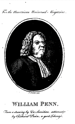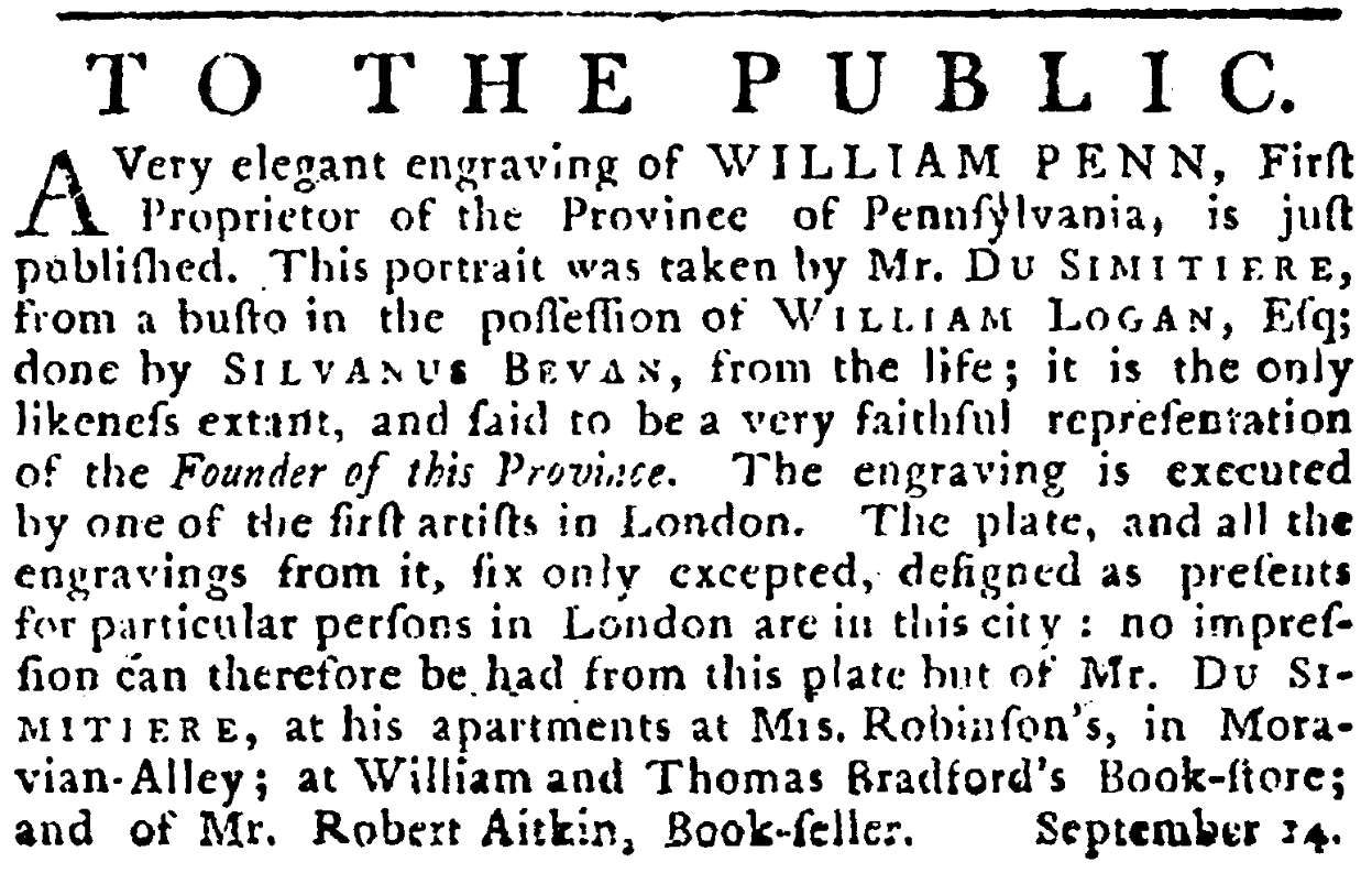 Du Simitière's was the earliest published portrait of Penn. He began advertising the print for sale in Sep 1774, when they presumably arrived from London. See John Nickalls, "Some Quaker Portraits Certain and Uncertain," Supplement of the Friends' Historical Society Bulletin, London (No. 29,1958) / https://journals.sas.ac.uk/FHSS/issue/view/562/50