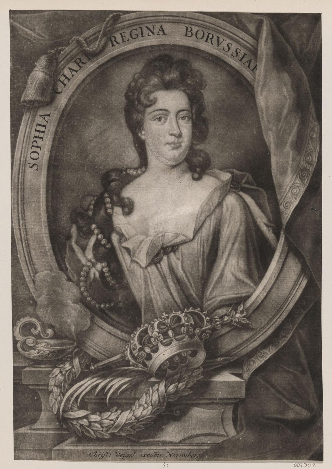 Possibly the mezzotint portrait pictured here by Christoph Weigel (1654-1725) of Queen Sophie Charlotte (1668-1705), consort of Frederick I (1657-1713), who was King in Prussia 1701-1713.