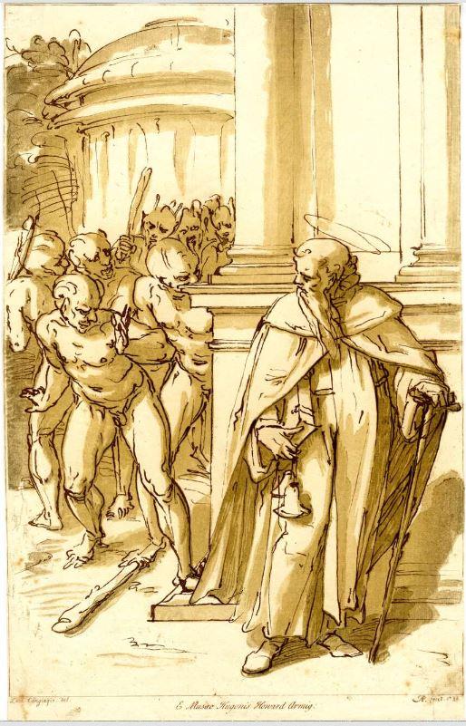 The only print after a drawing by Cambiasi in Pond's series "Prints in Imitation of Drawings" listed in Henry M. Hake, "Pond’s and Knapton’s Imitations of Drawings," Print Collector’s Quarterly, vol. 9, no. 4 (1922): 324-340 is one of St. Anthony pursued by demons (No. 3).