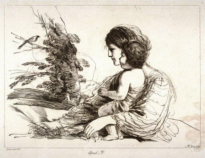 There are two images of Mary after Giovanni Francesco Barbieri (Guercino) (1591-1666) in Arthur Pond's series "Prints in Imitation of Drawings." One of them, Madonna and child watching a bird in a tree, is pictured here.