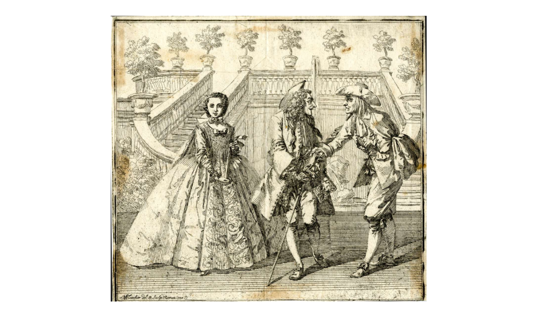 Du Simitière's print may have been this etching of 1738 by Carl Marcus Tuscher (1705-1751), which Fuseli called L'Amant vieillard (the old lover). Tuscher, a German painter and printmaker, made a copy of this print is reverse while he stayed in London in 1743; that version carries the legend: "Un Vecchio che d'Amor caldo non sente / Interrompe il Piacer d'un Core amante / Che in dolci note al Caro Ben d'avante / Cerca Spiegar la Fiamma Sua cocente."
