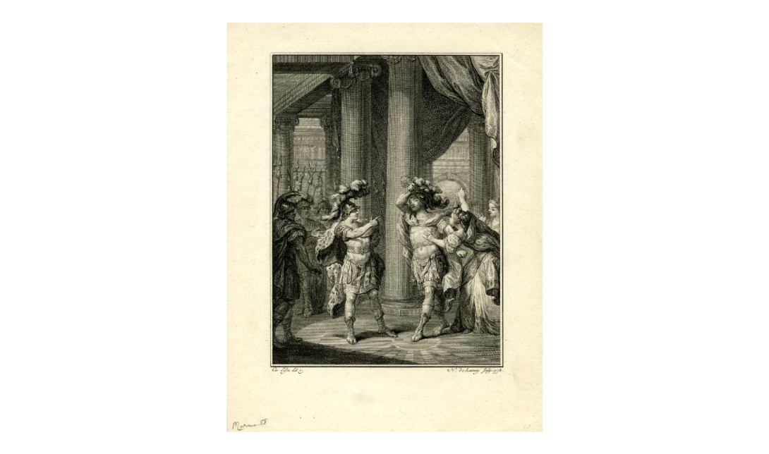 Nicolas de Launay (1739–1792) engraved many prints after original works by Charles Dominique Joseph Eisen (1720–1778). Pictured here is an etched and engraved 1773 illustration to André du Ryer's "Scévole," in Jean-François Marmontel's Chefs d'oeuvre dramatiques (Paris, 1773).