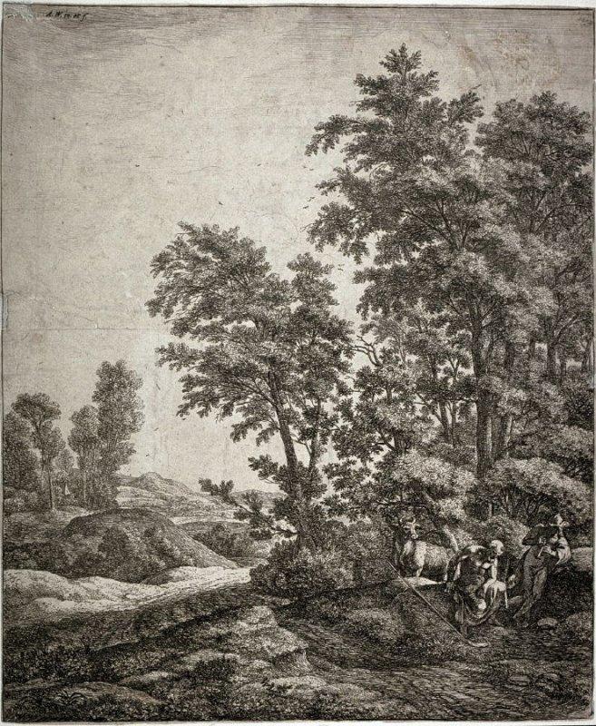 Anthonie Waterloo (1609-1690) was a painter and draftsman, but is primarily known for his etchings, which he published himself. Almost 140 prints have been attributed to him. One of the larger etchings (11 5/16 x 9 1/2 in.), Landscape with Mercury playing flute for a seated man, is pictured here.