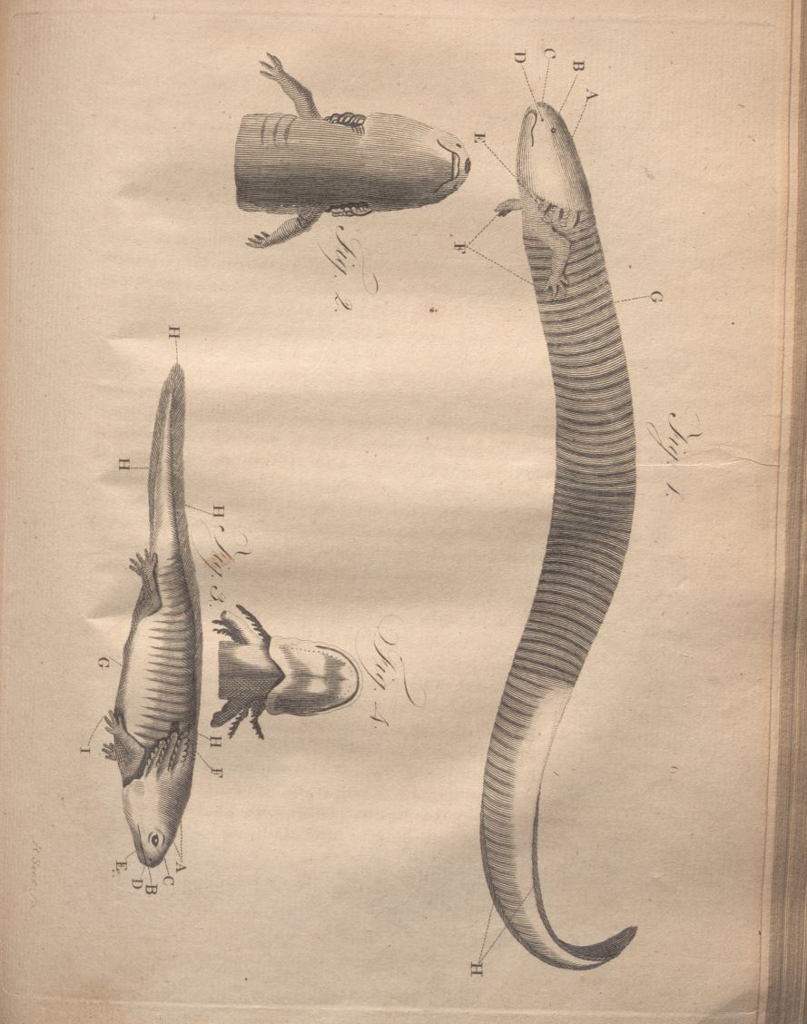 In the plate, pictured here, the mud inguana is depicted in Figs. 1 and 2, the Siren operculata in Figs. 3 and 4.