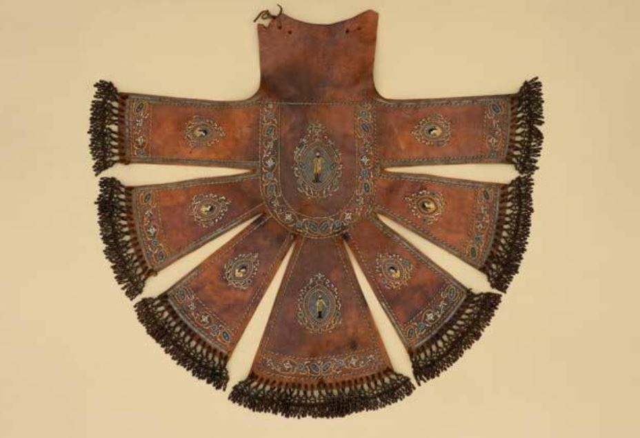 Peale’s use of the term “Moorish” to describe the ensemble is apt, since Spanish and colonial Spanish horse gear, horses, and equestrian culture were heavily influenced by the Islamic occupation of Spain. They were also patterned after medieval European horse armor and trappings used by elites, which were often covered with heavy brocades, velvets and tapestries and embellished with figurative embroidery and luxury trims.