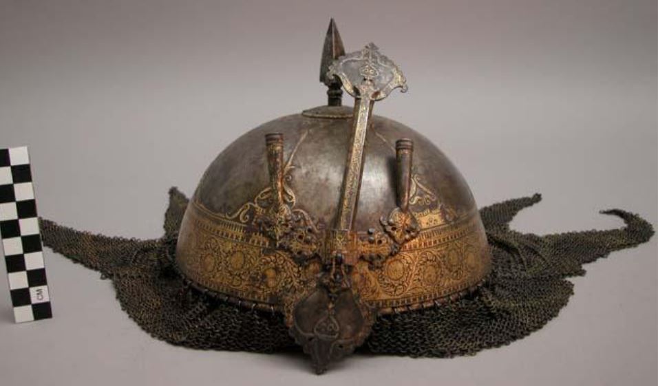 "Viz. 3 Jackets made of rings of different metals interwoven [of prodigious weight]. A Coat of Mail, composed of Crimson Velvet richly studded with Gold & finished with plates of Steel highly ornamented, on the Breast, back & sides, the whole of this quilted with Cotton, between which and the Velvet, is a curious interlining of large Fish-scales -- the Arms are enclosed from the Elbow in what may be called Boxes of embossed Steel trimmed with studded Velvet, and fastened on with Buckles. This appears to be part of the Dress of an Emperor or Commander in Chief. Two embossed Helmets with Wire Netttings, Several Elegant & curious Sabres & Daggers, Canteens made of Ivory & Buffaloes Horns. A Curious Astronomical Instrument & other Miscellaneous articles."