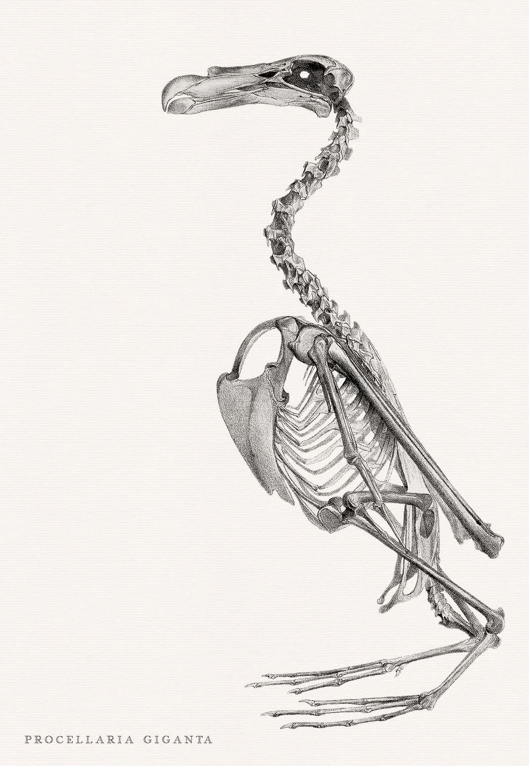 There are five species of Procellaria, a genus of Southern Ocean long-winged seabirds, and all are named petrel. An image of the skeleton of Procellaria giganta is pictured here.