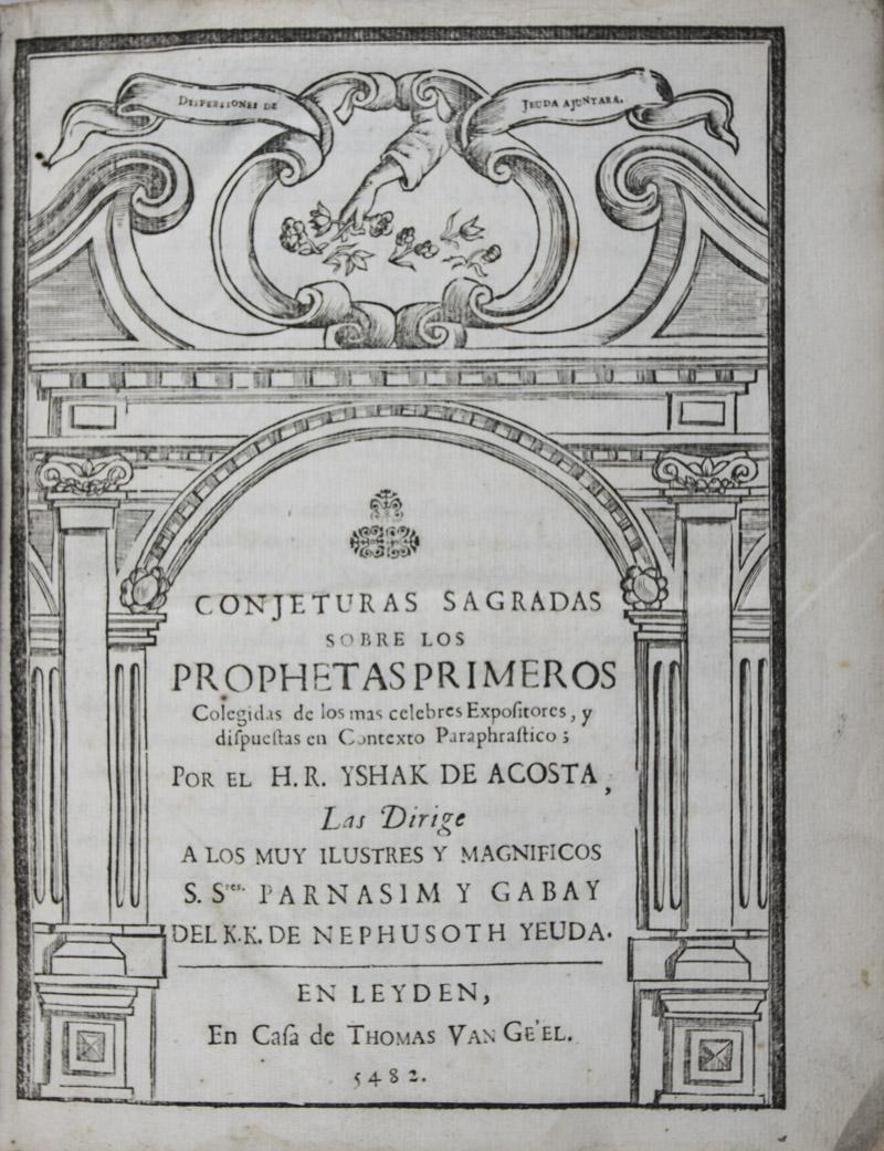 This book was very likely Isaac de Acosta's Conjeturas sagradas sobre los Prophetas primeros, containing a new translation and a paraphrase of Joshua, Judges, Samuel, and Kings.Christie's reports: "Contrary to the indication on the title, the typography of this edition gives evidence that it was not printed in the Netherlands, but in France, probably in Bayonne. Isaac de Acosta (or da Costa) had been educated in the Sephardic community Talmud Torah of Amsterdam, under the guidance of Haham Isaac Aboab da Fonseca, the first American rabbi, to whom he dedicated the work. From about 1690 he served as hazan (cantor) in the Sephardic community of Peyrehorade, France. In 1697 he was appointed rabbi of the congregation of Nepusoth Jehudah, in Bayonne. His grave is still preserved in the Jewish cemetery of that city." / https://www.christies.com/lot/acosta-isaac-de-conjeturas-sagradas-sobre…