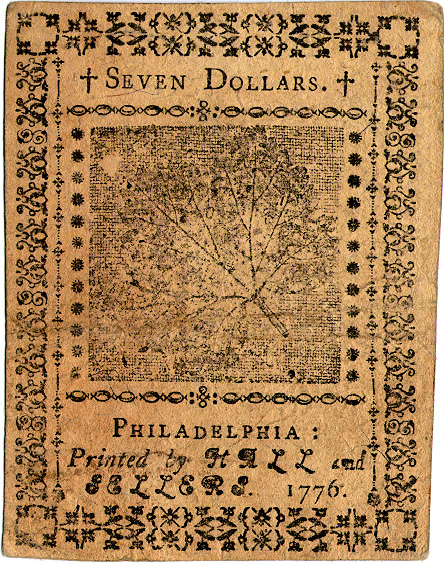 Continental currency notes of the denomination of $7 were authorized by Resolutions of the Continental Congress in 1775 and on 17 Feb, 9 May, 22 July, and 2 Nov 1776. See Eric P. Newman, The Early Paper Money of America, 5th ed. (Iola, Wis., 2008), p. 61. The notes were designed by Benjamin Franklin and printed in Philadelphia by his successors Sellers and Hall. Franklin wrote of his $7 bill: "Another of the bills has for its device, a storm descending from a black heavy cloud, with the motto, SERENABIT; It will clear up. This seems designed to encourage the dejected, who may be too sensible of present inconveniences, and fear their continuance. It reminds them, agreeable to the adage, that after a storm comes a calm." (Pennsylvania Gazette, 20 Sep 1775) The nature print on the back is of a buttercup. The paper contains blue threads and mica flakes to deter counterfeiting.