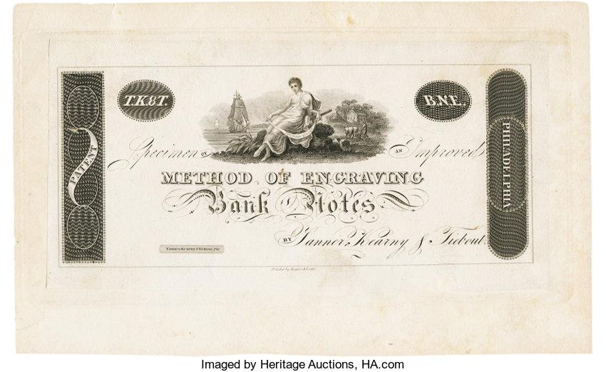 Francis Kearny (1785–1837) was born in Perth Amboy, N.J. After studying drawing in New York City, he apprenticed to an engraver there at age eighteen. Kearny opened his own engraving business in New York before moving to Philadelphia in 1810. After partnering briefly in several firms, he worked on his own, specializing in engravings for periodicals and religious works. His partners at the time he donated this banknote were Benjamin Tanner (1775-1848) and Cornelius Tiebout (ca. 1773-1832). H. Glenn Brown and Maude O. Brown, A Directory of the Book-Arts and Book Trade in Philadelphia to 1820, Including Painters and Engravers (New York, 1950)