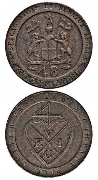 Pictured here is a 1794 copper 1/48 rupee coin of the East India Company.