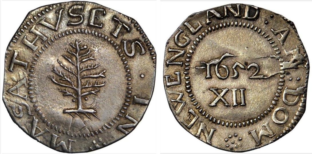 There are several varities of 1652-dated Massachusetts shillings, including the oak tree and the willow tree, but the pine tree is the most common. See Christopher Salmon, Silver Coins of Massachusetts: Classification, Minting Technique, Atlas (2011), pp. 190-191.