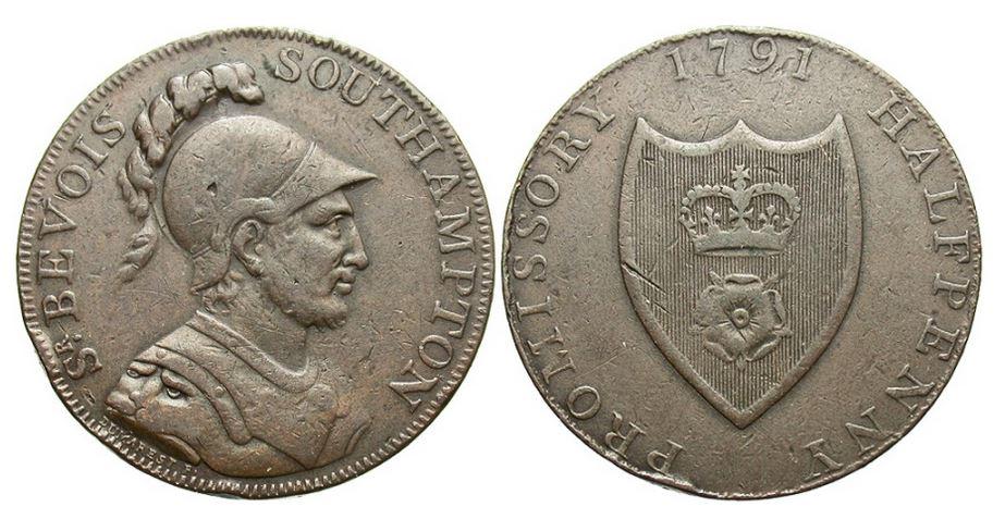This may have been a Southampton Conder token (halfpenny). An example of 1791 is pictured here. Conder tokens, also known as 18th-century provincial tokens, were a form of privately minted token coinage struck and used during the latter part of the 18th century and the early part of the 19th century in England, Anglesey and Wales, Scotland, and Ireland. They were the size, composition, and weight of English halfpence coppers. They were first cataloged by James Conder in 1798, but a more recent reference is Richard Dalton and Samuel H. Hamer, The Provincial Token-Coinage of the 18th Century (1910-1917).