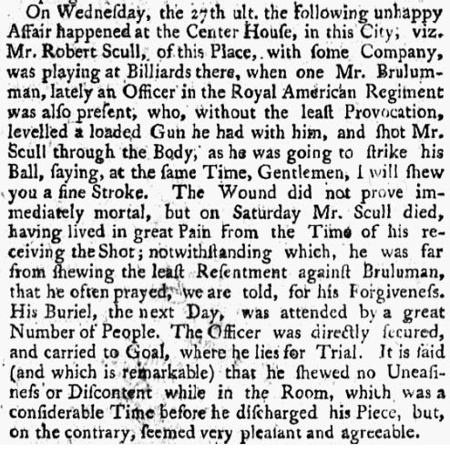 This macabre entry records the trigger finger of one Broliman, a former British soldier in the Seven Years' War, who was despondent and wanted to end his life. He did so by murdering a total stranger, Robert Scull, in Philadelphia on 27 Aug 1760 so as to ensure his execution, which followed. Peale related the tale at length for its moral lessons, both in the Accessions Book and in the many newspapers throughout America that carried his account of this acquisition. The account appeared in newspapers in Sep 1760 in Philadelphia, New York (pictured here), Portsmouth, N.H., Boston, and New London, Conn. See H. U. Hall, "A Link with the Old Peale Museum," University of Pennsylvania, The Museum Journal, 16 (1925): 64-69 / https://www.penn.museum/documents/publications/journal/16-1/linke_with_…