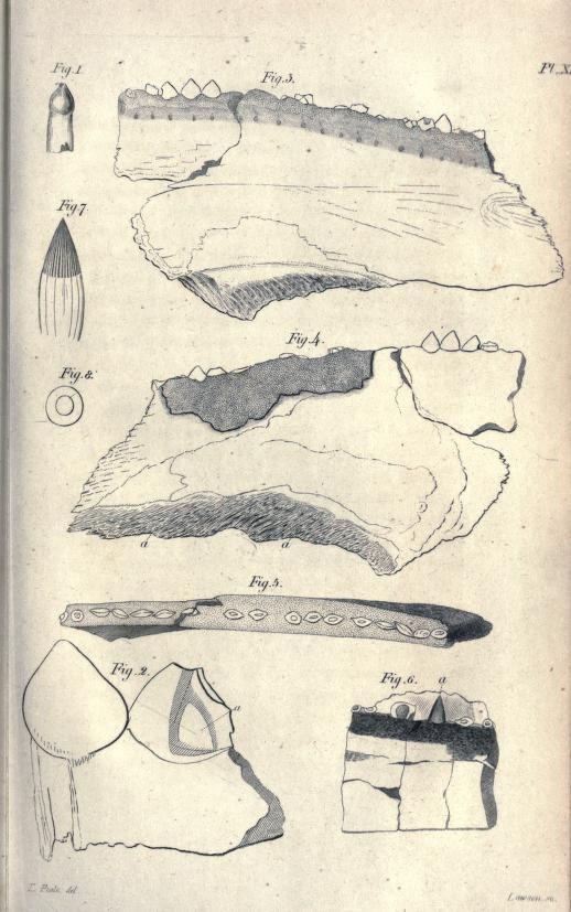 "Deposited in the collection of British fossils in the Philadelphia Museum. The specimen was originally from Bath or Bristol, and is easily recognized, at first view, for a portion of the dental bone of some Aurian reptile."