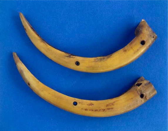 This bear claw from Mackenzie may have been one of those pictured here. They are among the many cultural items that the Peabody Museum of Archaeology and Ethnography, Harvard University, acquired in 1899 from Moses Kimball's Boston Museum. Kimball and P. T. Barnum jointly purchased many of the Peale collections when they were sold about 1849. These claws were perforated for stringing in a necklace.