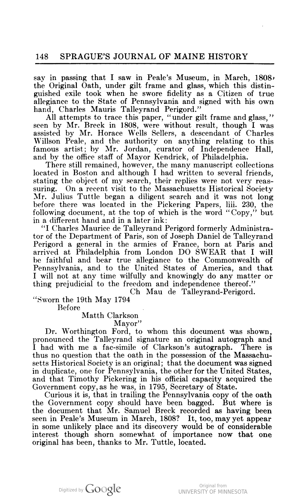Charles-Maurice de Talleyrand-Périgord (1754-1838), Fench clergyman and official, was in the U.S. from 1794-1796 during the French Revolution. He took an oath of allegiance to Pennsylvania and the United States on 19 May 1794. A copy of the original manuscript is pictured here. For the text of the oath, see https://archive.org/details/memoirsofmatthew00hall/page/68/mode/2up See William Otis Sawtelle, "Talleyrand's Oath of Allegiance," Sprague's Journal of Maine History, vol. 12, no. 3 (1924): 147-48, also reproduced here.