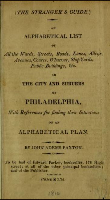 Paxton was a publisher of city directories for Philadelphia, New Orleans, and St. Louis. The pamphlet was his own new work, The Stranger's Guide. An Alphabetical List of All the Wards, Streets, Roads, Lanes, Alleys, Avenues, Courts, Wharves, Ship Yards, Public Buildings, &c. in the City and Suburbs of Philadelphia, with References for Finding Their Situations on an Alphabetical Plan (Philadelphia, 1810).
